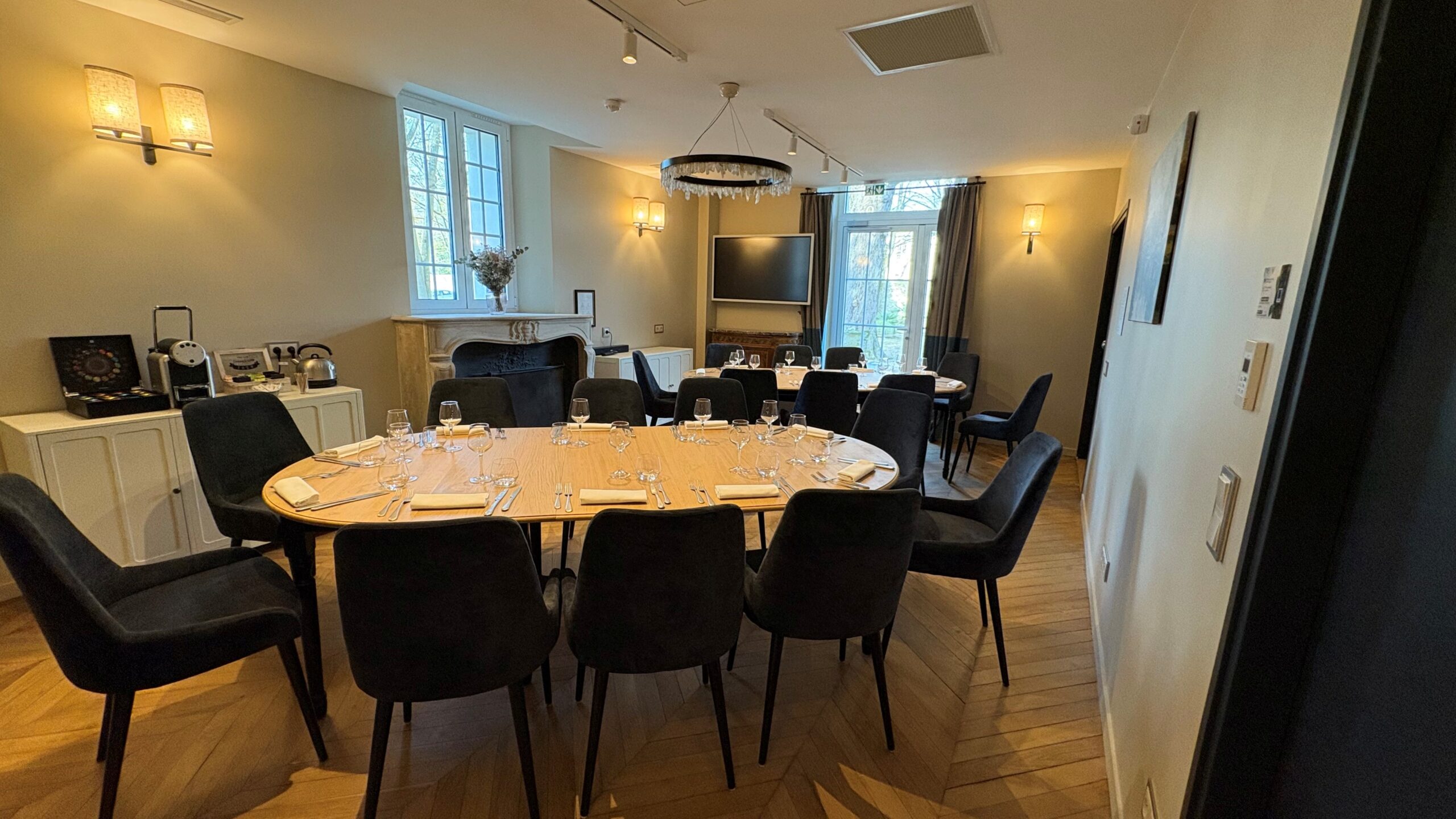 two strategic rooms, salon Cassatt and salon Morisot, with 2 metre flat TV screens for video-conferences in person or remote. They each have private access and one has access to the garden.